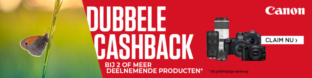 Koop van 13 maart 2026 t/m 30 april 2026 een geselecteerde Canon EOS R camera of objectief en profiteer van flinke cashback, die zelfs verdubbeld wordt bij aankoop van 2 of meer deelnemende producten! Registreer je aankoop voor 15 mei 2026 en je ontvangt het betreffende cashback bedrag terug op je rekening. Kijk voor de actievoorwaarden op canon.nl/double