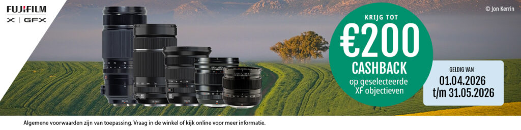 Koop tussen 1 april en 31 mei 2026 een van de geselecteerde Fujifilm XF objectieven en profiteer van een cashback tot wel 200 euro! Claim hier je cashback!
