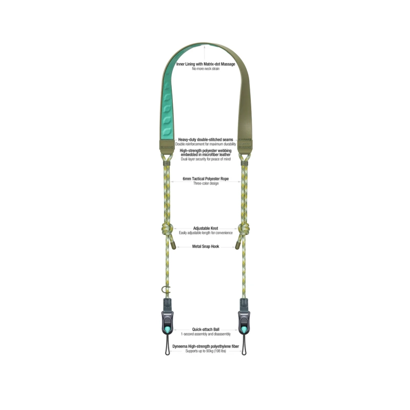 De Leofoto Camera Black & White  is gemaakt van hoogwaardig nylon met versterkte lederen uiteinden, wat zorgt voor extra stevigheid en een lange levensduur. De strap voelt licht aan, maar biedt uitstekende ondersteuning, ook bij zwaardere camera’s. De natuurlijke veerkracht van het materiaal zorgt ervoor dat het gewicht gelijkmatig wordt verdeeld, wat vermoeidheid vermindert tijdens lange opnamedagen.